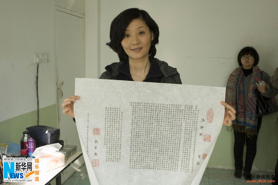 当天,张杨导演的父亲——张华勋老导演也亲临片场探班,并将一幅亲笔提写的精美书法作品“洛神赋”赠予徐帆,感谢徐帆能不计片酬、诚意满怀地参与到一部集结了几乎全部新中国老艺术家们主挑大梁的电影中友情客串,甘当“绿叶”。【张扬导演电影新作《飞越老人院》于2011年10月5日在天津片场特别安排了一场激昂有趣又不失温馨的媒体探班活动。这部集结了几乎全部新中国当代著名老艺术家的电影,在导演张杨嘴里,却是一部几近“疯狂”的青春励志片。】